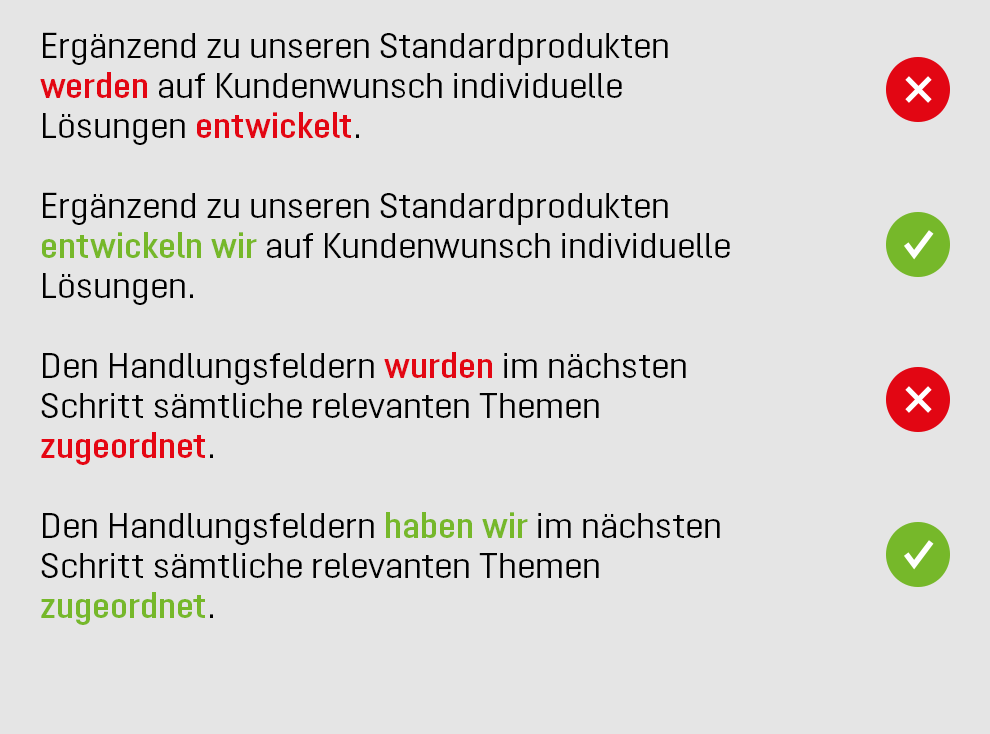 Wir wissen, wo’s langgeht. Das lassen wir den Leser spüren, indem wir in unseren Texten die Initiative übernehmen. Hierfür präsentieren wir uns als modernes Unternehmen und setzen auf aktive Verben und sprachlichen Scharfsinn, ohne dabei zu überdrehen.