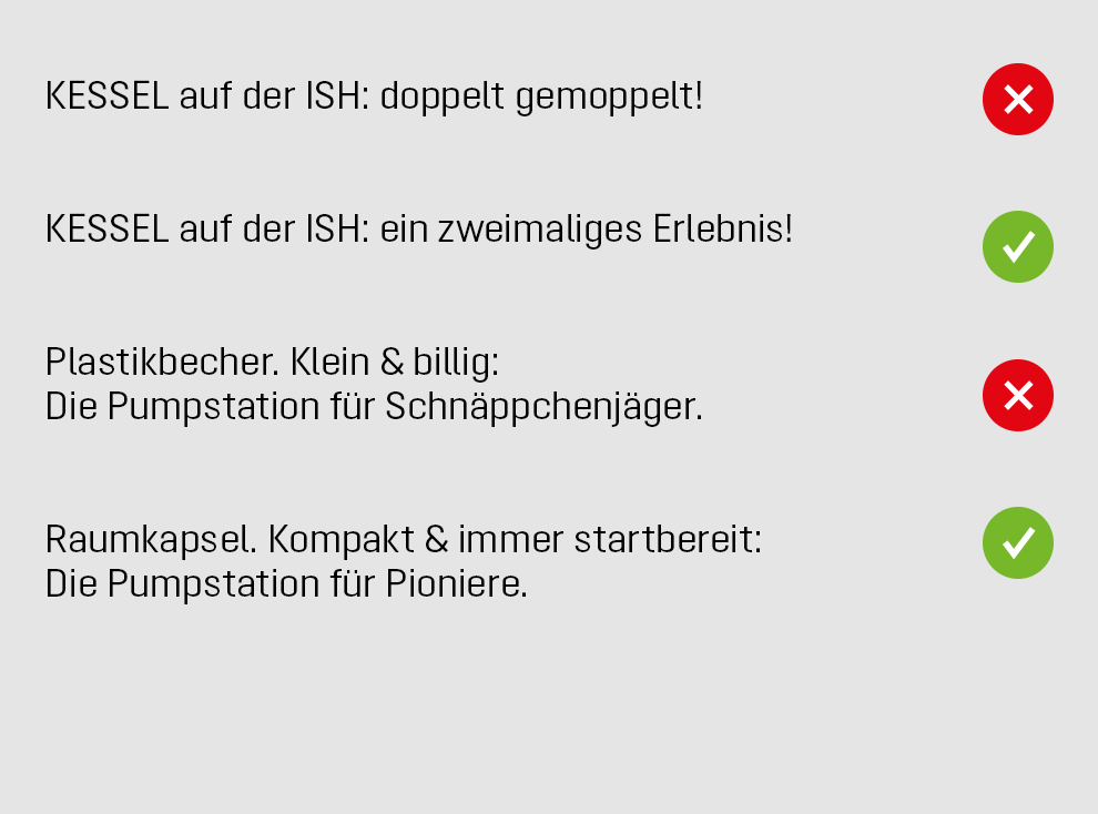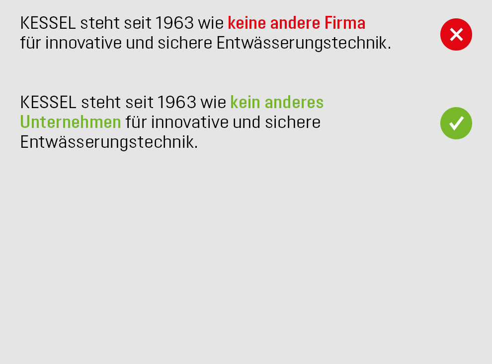 Die KESSEL-Stimme erzeugt die gewünschte Wirkung, indem sie unsere Markenwerte Qualität, Innovation, Sicherheit und Service in menschliche Charaktereigenschaften überträgt. Diese schlagen sich konkret in zielgerichteten Ausdrucksweisen nieder. Dos & Don’ts zur praktischen Umsetzung finden Sie weiter unten auf dieser Seite.