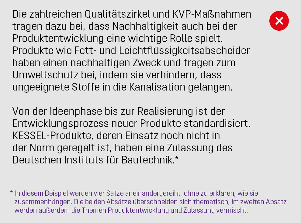Wir wissen, wovon wir reden. Um auch unsere Leser davon zu überzeugen, legen wir großen Wert darauf, dass die KESSEL-Stimme fachlich über jeden Zweifel erhaben ist. Deshalb verlässt kein Text unser Haus ohne genaue Prüfung. Darüber hinaus formulieren wir eindeutig und verwenden einheitliche Marken-/Fachbegriffe und Schreibweisen.