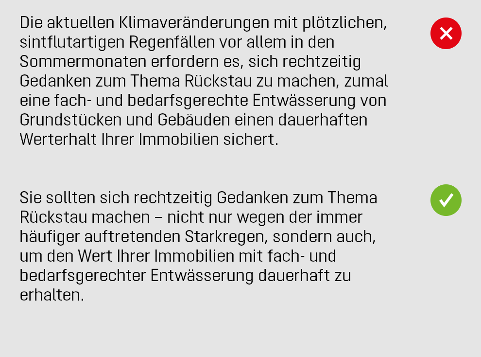 Wir sind da, wenn man uns braucht. Das vermitteln wir in Inhalt und Sprache, indem wir uns nah am Leser präsentieren. Dafür formulieren wir unsere Texte vorwiegend in der Wir-Perspektive und räumen unseren Lesern und ihren Bedürfnissen einen hohen Stellenwert ein.