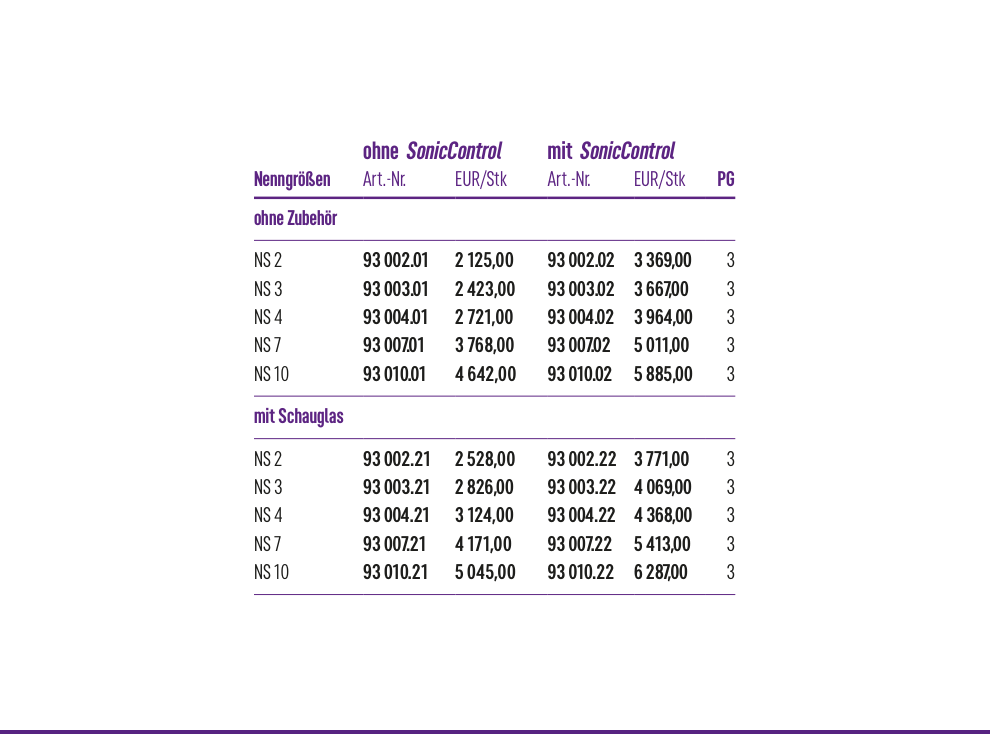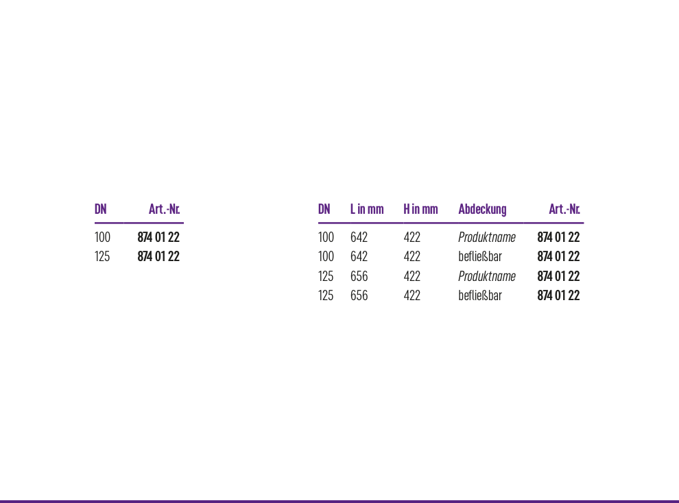 Tables are created according to their intended use and have different numbers and sizes of columns and rows. It is important to have a clear separation between the list and content as well as the subdivisions in complex tables. Two line thicknesses are used in order to achieve this: 1 pt and 0.5 pt.