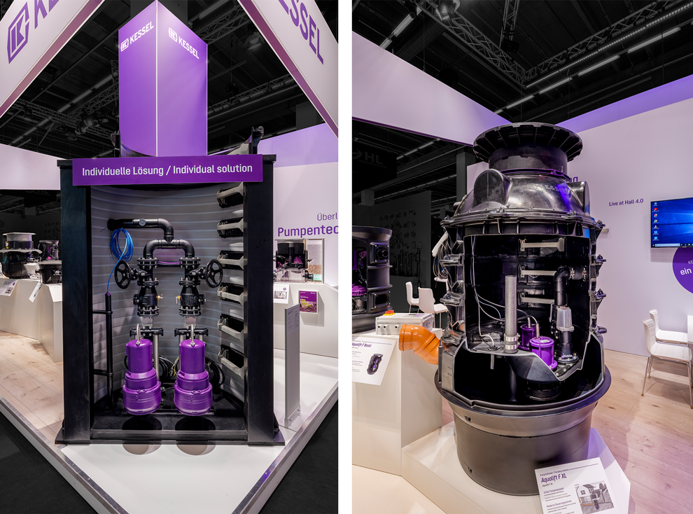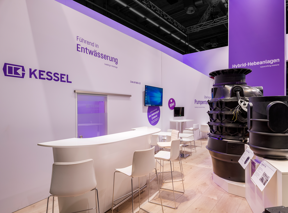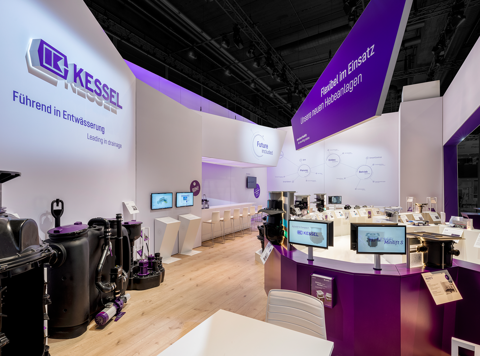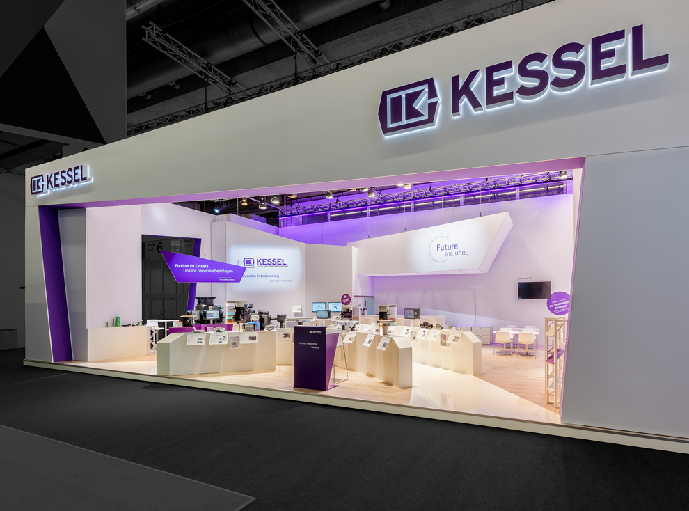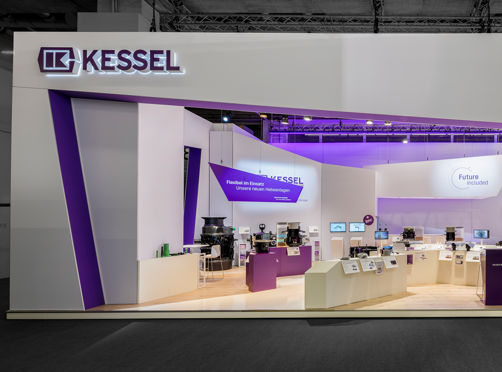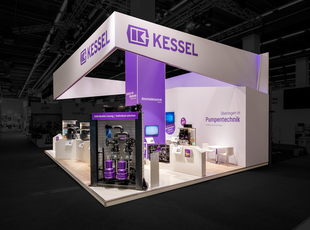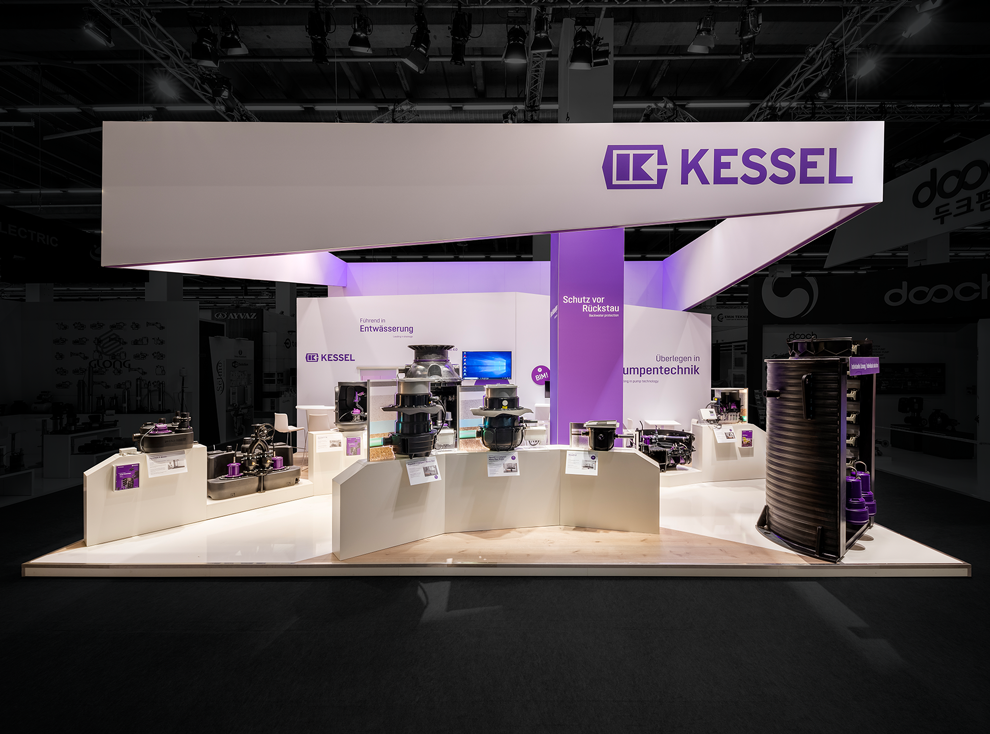 Our high-quality trade fair booths make us stand out from the rest at busy exhibitions. The mixture of open architecture and the specific use of colour and lighting invites trade fair visitors to immerse themselves in the world of KESSEL.