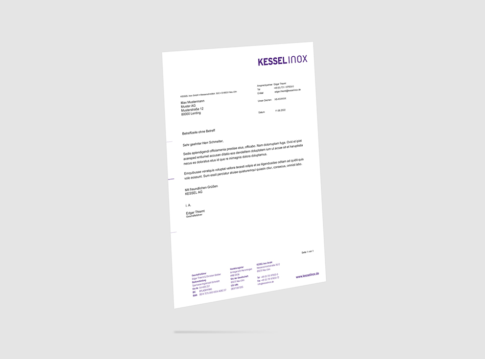 KESSEL Inox ist ein Tochterunternehmen der KESSEL mit Sitz in Neu-Ulm: Dort arbeiten die Experten für Edelstahl. Um auch in der Öffentlichkeit als eine Einheit wahrgenommen zu werden, finden sich im Corporate Design viele verbindende Elemente.